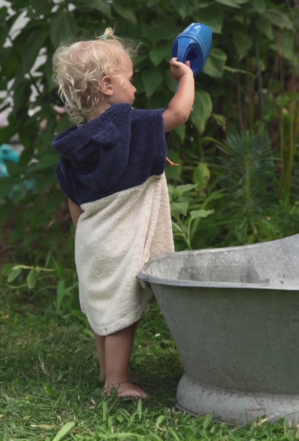 Der Baby Badeponcho ist in der Seitennaht offen und kann durch Druckknöpfe geschlossen werden. Zusätzlich gibt es einen Druckknopf zwischen den Beinen, damit er auch als Strampler verwendet werden kann, ohne zu verrutschen. Die Bärenohren machen ihn zum wohl süßesten Geschenk auf jeder Babyparty!